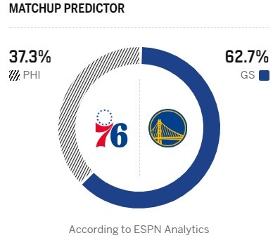 今天ESPN曬出了本場比賽的勝率預測,76人只有37.3%,勇士為62.7%。
