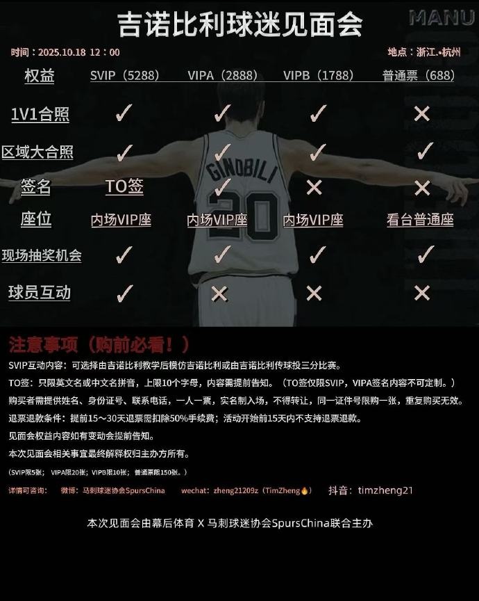 9月19日訊 馬刺名宿馬努-吉諾比利將在下月開(kāi)展中國(guó)行活動(dòng)。吉諾比利在杭州的球迷見(jiàn)面會(huì),SVIP票價(jià)為5288元,VIPA為2888元,VIPB為1788元,普通票為688元。