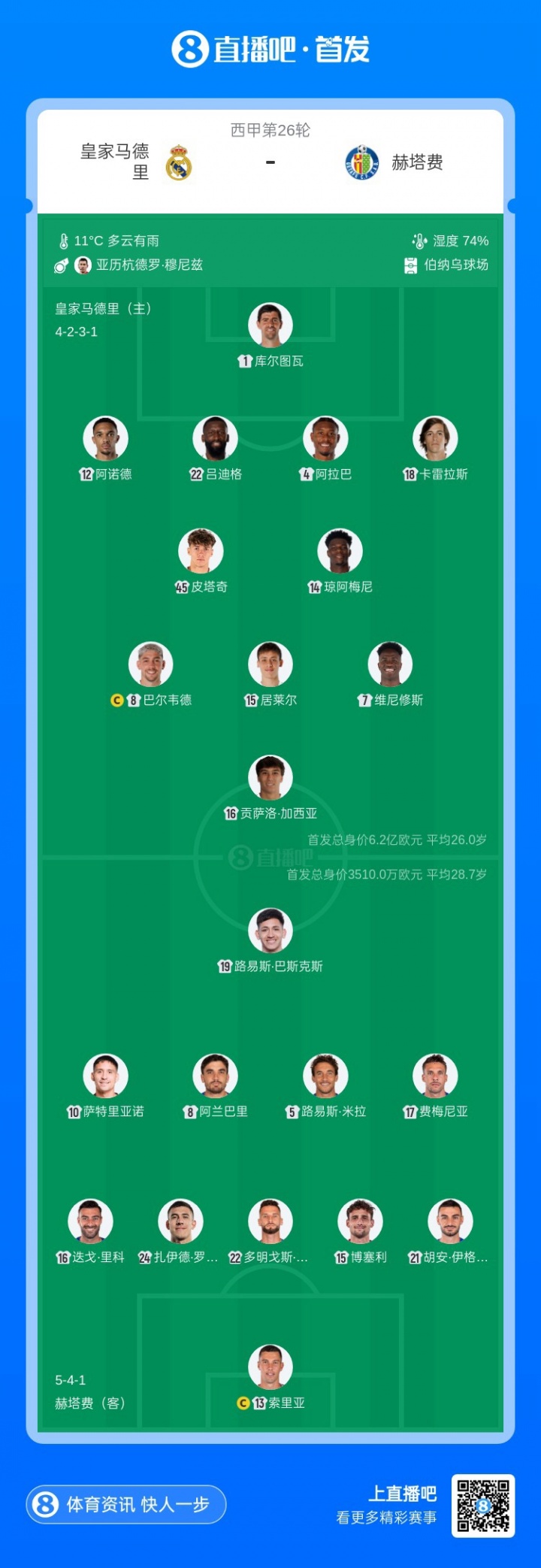 皇馬首發(fā):1-庫爾圖瓦、12-阿諾德、22-呂迪格、4-阿拉巴、18-卡雷拉斯、8-巴爾韋德、15-居萊爾、14-瓊阿梅尼、45-蒂亞戈·皮塔奇、16-貢薩洛·加西亞、7-維尼修斯