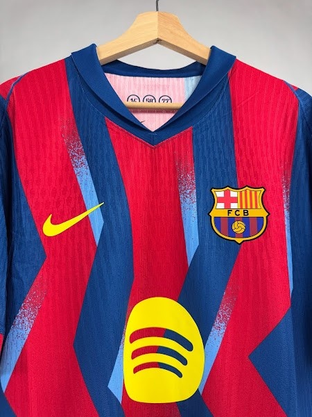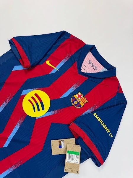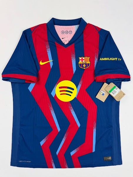 與20年前的經(jīng)典藍(lán)紅條紋不同,巴塞羅那2025-26賽季第四球衣采用了藍(lán)色和紅色的鋸齒形條紋,并帶有淺藍(lán)色的圖形元素。
