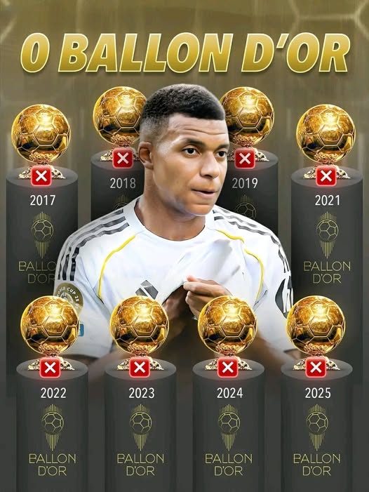 2025年的金球獎和FIFA年度最佳都已結(jié)束評選,兩大個人獎項姆巴佩依舊無緣,金球排名第7、FIFA年度最佳排名第3。