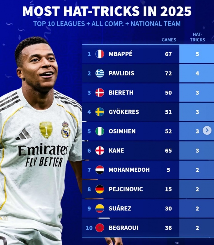 1月3日訊 2025年已經(jīng)過去,《轉會市場》也統(tǒng)計了2025年前十聯(lián)賽球員的俱樂部+國家隊各項賽事雙響次數(shù)和戴帽次數(shù),姆巴佩同時領跑雙榜。