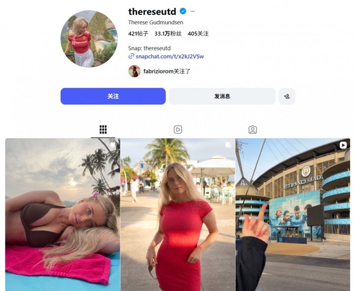 Therese Gudmundsen在Ins上擁有超過30萬粉絲,平時她經(jīng)常身穿曼聯(lián)球衣拍攝寫真。在最新的帖子中,她發(fā)布了自己在斯里蘭卡度假的照片,她身穿比基尼躺在沙灘上擺pose拍照,還曬出一張自己享用水果沙拉的照片。