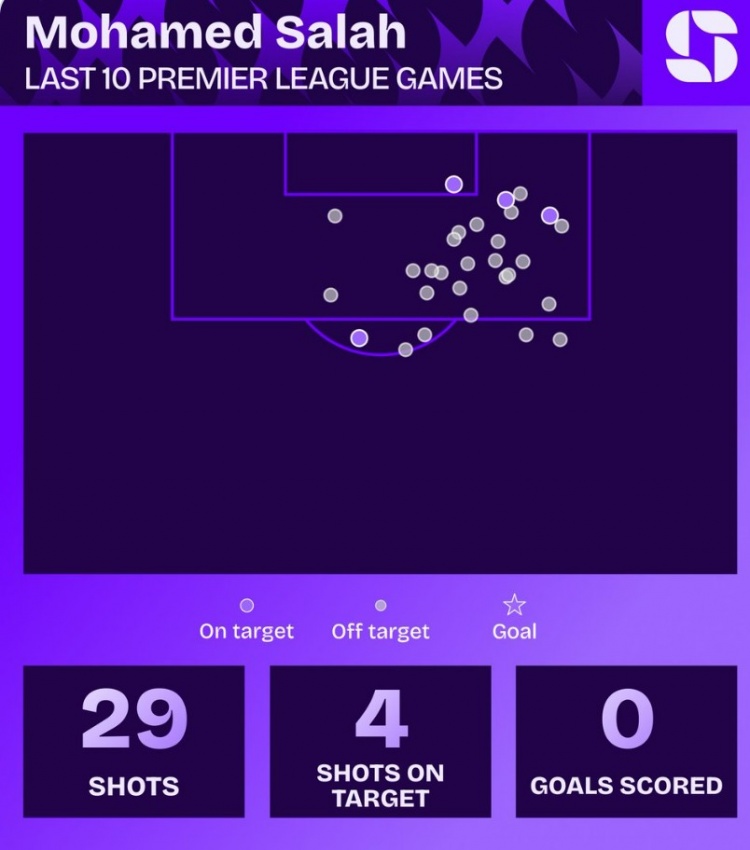 薩拉赫近10場英超比賽數據:禁區(qū)觸球80次,射門29腳0進球
