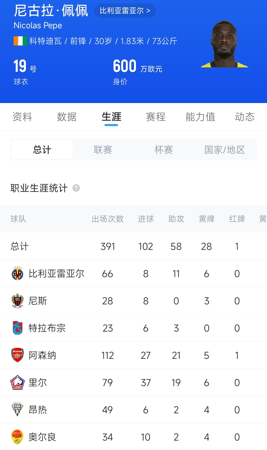 佩佩最為人熟知的一段經(jīng)歷是效力阿森納時期。2019年阿森納花費(fèi)8000萬歐元,從里爾簽下在法甲表現(xiàn)出色的佩佩,當(dāng)時他的身價高達(dá)7500萬歐元。效力槍手3年時間,佩佩共為阿森納出戰(zhàn)112場比賽,打進(jìn)27粒進(jìn)球,送出21次助攻,2023年阿森納提前一年與佩佩解約。