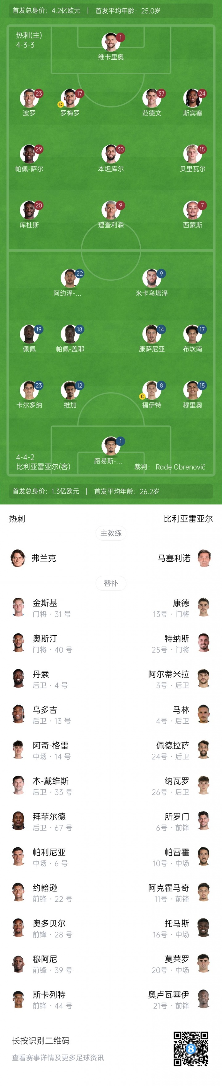 熱刺方面,新援哈維-西蒙斯首發(fā)與理查利森、庫(kù)杜斯搭檔鋒線,穆阿尼則替補(bǔ)待命。黃潛方面,新援維加、米卡烏塔澤先發(fā),前槍手中場(chǎng)托馬斯替補(bǔ)。