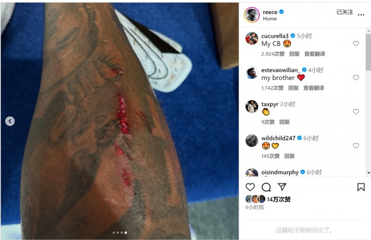 10月5日訊 英超第7輪比賽,里斯-詹姆斯踢滿全場,切爾西主場2-1擊敗利物浦。里斯-詹姆斯賽后更新社媒動態(tài),曬出比賽照片,以及腿上的傷口。庫庫雷利亞留言:“我的中衛(wèi)?!?/p>埃斯特旺留言:“我的大哥?!?/p>