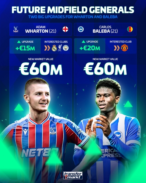 10月17日訊 德轉(zhuǎn)今日更新英超身價(jià),其中巴萊巴和沃頓都得到了大幅提升,漲至6000萬歐。沃頓本次的漲幅是1500萬歐,巴萊巴漲幅是2000萬歐。