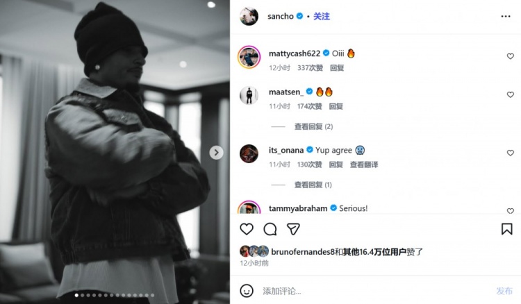 根據(jù)曼晚的報道,桑喬的前曼聯(lián)隊友拉什福德、B費以及馬拉西亞點贊了這個帖子,現(xiàn)維拉隊友阿馬杜·奧納納、卡什以及馬特森則發(fā)表了評論。